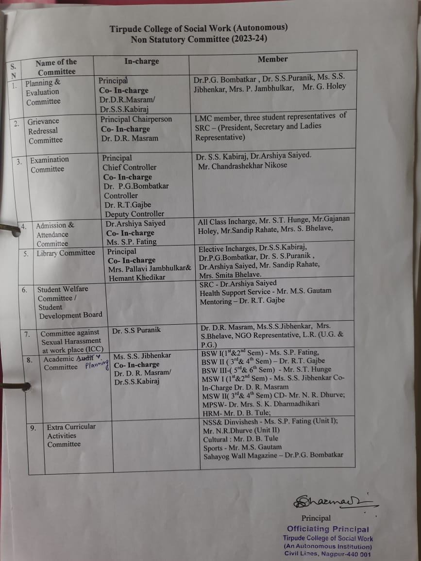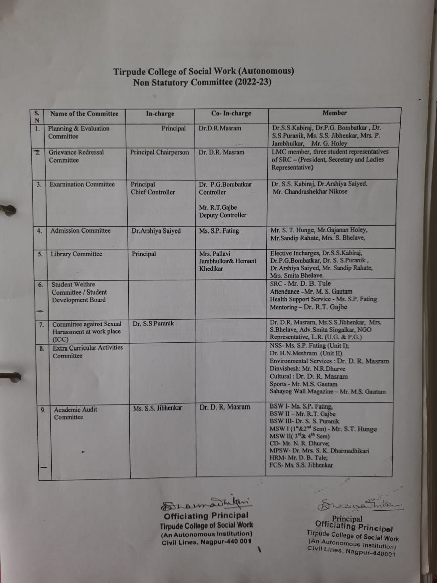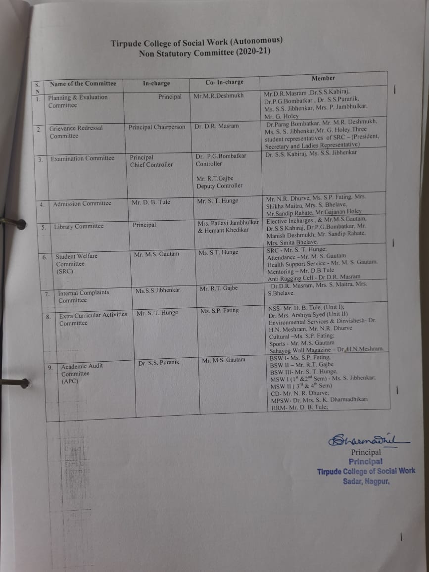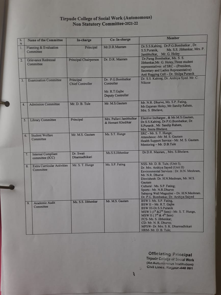 Dr.Parag Bombatkar, Mr. M.R. Deshmukh, Ms. S. S. Jibhenkar,Mr. G. Holey,Three student representatives of SRC – (President, Secretary and Ladies Representative) |