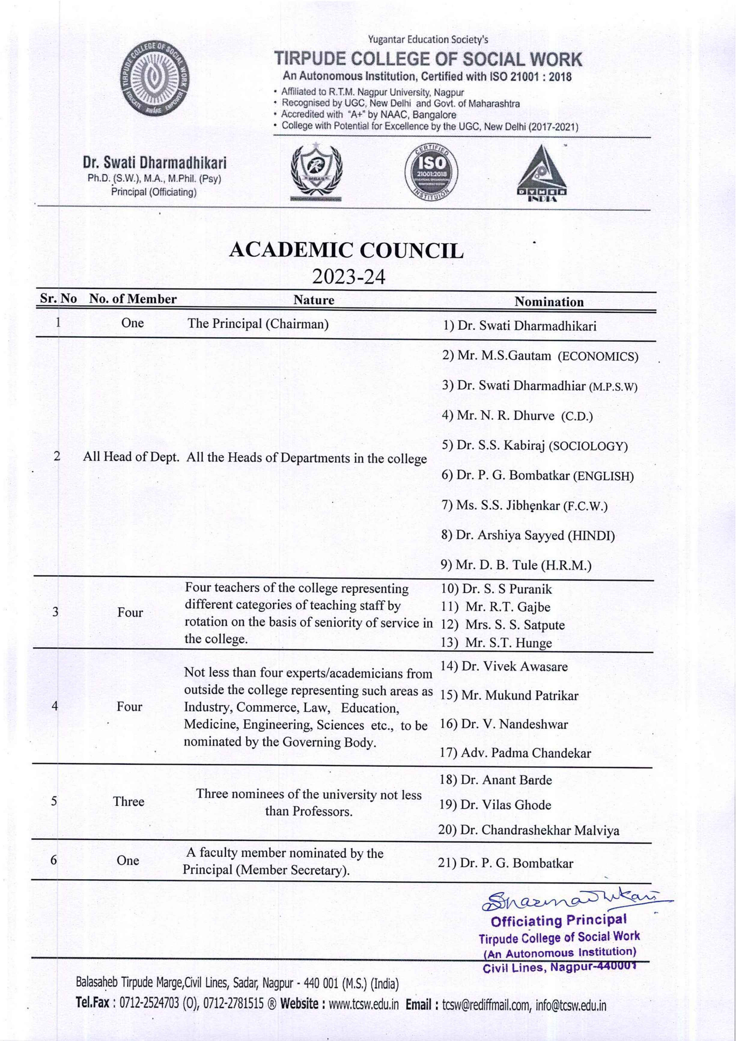 Welcome to Tirpude College of Social Work , Nagpur -- -- An Autonomous Institution , Certified with ISO 21001 : 2018 Affiliated To R.T.M Nagpur University, Nagpur . Recognised by UGC ,New Delhi and Govt of Maharashtra , Accredited with A+ grade with 3.51 CGPA by NAAC, Bangalore in 3rd cycle , College with Potential for Excellence by the UGC , New Delhi (2017-2021). Admission open for session 2023-2024 For B.S.W.-I, M.S.W.-I (As per R.T.M.N.U. Schedule)