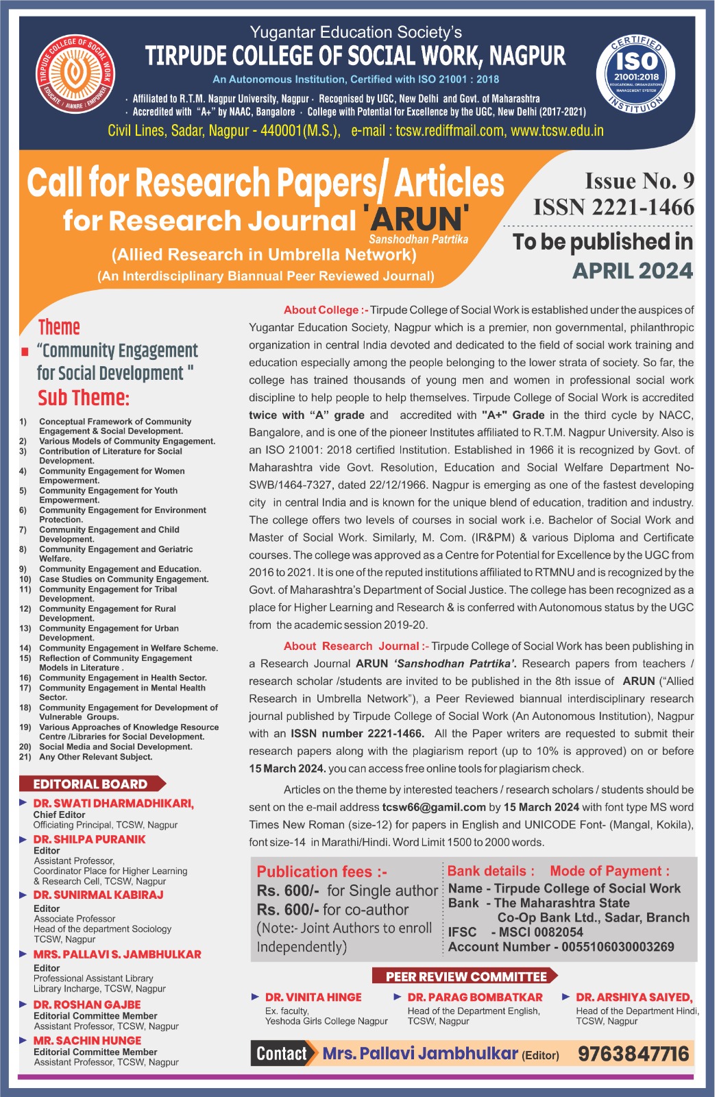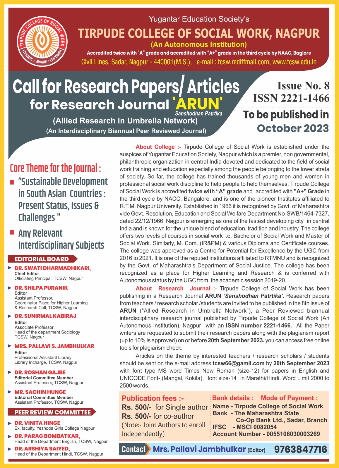 Welcome to Tirpude College of Social Work , Nagpur -- -- An Autonomous Institution , Certified with ISO 21001 : 2018 Affiliated To R.T.M Nagpur University, Nagpur . Recognised by UGC ,New Delhi and Govt of Maharashtra , Accredited with A+ grade with 3.51 CGPA by NAAC, Bangalore in 3rd cycle , College with Potential for Excellence by the UGC , New Delhi (2017-2021). Admission open for session 2023-2024 For B.S.W.-I, M.S.W.-I (As per R.T.M.N.U. Schedule)