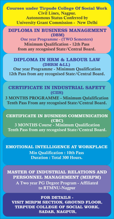 Welcome to Tirpude College of Social Work , Nagpur -- -- An Autonomous Institution , Certified with ISO 21001 : 2018 Affiliated To R.T.M Nagpur University, Nagpur . Recognised by UGC ,New Delhi and Govt of Maharashtra , Accredited with A+ grade with 3.51 CGPA by NAAC, Bangalore in 3rd cycle , College with Potential for Excellence by the UGC , New Delhi (2017-2021). Admission open for session 2023-2024 For B.S.W.-I, M.S.W.-I (As per R.T.M.N.U. Schedule)