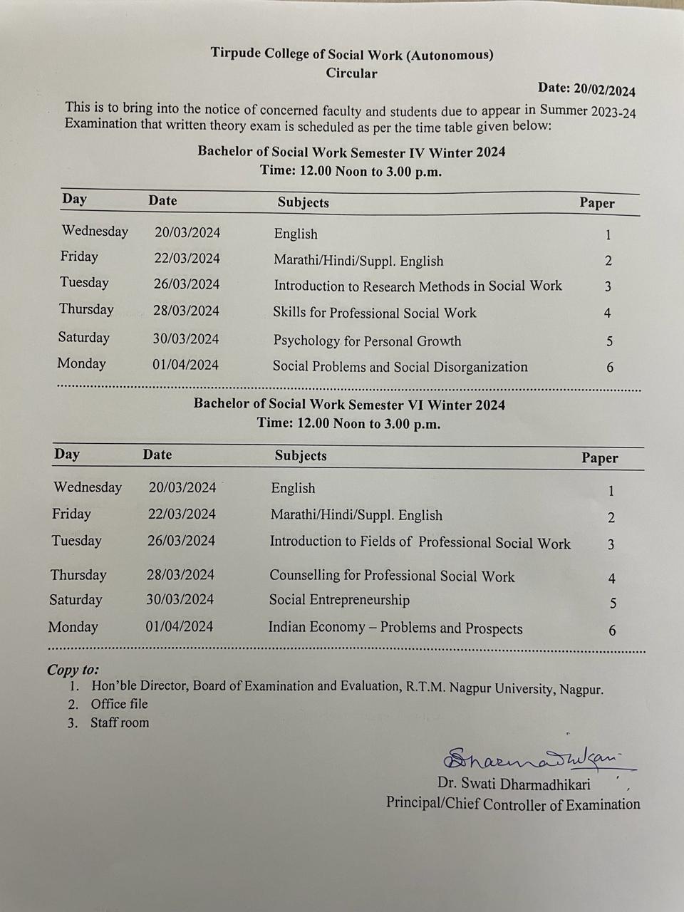 Winter Exam Time Table 2024